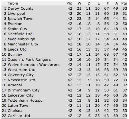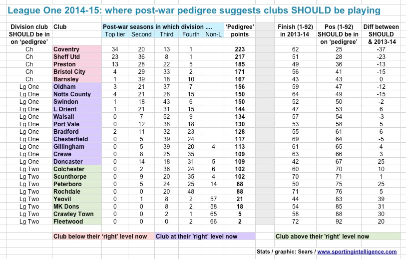 By Brian Sears 8 August 2014 With the 2014-15 English football season about to begin, and with every fan still at the stage where they can dream that this will be the year, the notion of where a club 'deserves' to be is again a topic of relevance. Up and down the country there will be supporters who will assure you that their team 'should' be in the top four, or top six, or top division, or top two divisions. And there will be others who will assure you their team does not 'belong' in the lowly place where they currently reside. It is uncontroversial enough to say that fans of Manchester United (and City), and Arsenal and Liverpool and Chelsea will believe they should have an excellent shot of finishing in the Premier League's top four. Some Everton fans too, will probably argue that, and those of Spurs. And there will be plenty from other clubs who swear their club's 'rightful' place is in the Premier League. Leeds fans will be most likely loudest on this subject (with some justification). Those who support Blackburn and Wolves, both Sheffield clubs and Middlesbrough and Derby will also make claims. Lower down the divisions, Coventry fans will tell you they really shouldn't be in the third tier, and lower still, Portsmouth, twice champions of England, can argue that really, all things being equal, they should be at least two divisions higher. Before we use one method to explore where clubs 'should' be playing, it is worth looking at a historic league table, from 40 years ago, the 1974-75 season, below. It is notable not only for the absence of Manchester United, and for the presence of the likes of Carlisle and Luton, but also for how many of the same names will contest the forthcoming 2014-15 Premier League; twelve of the same teams who contested the 1974-75 top division. Article continues below