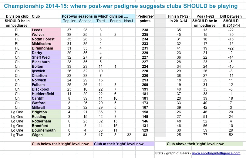. The graphic shows where each club finished in the league (1 to 92) last season; where their 'pedigree' says they 'should'; and the difference. A difference in single digits is really neither here nor there. That Palace, Hull and Swansea finished 23, 28 and 36 places about their 'natural' post-war level is especially commendable. Looking at the 2014-15 Championship (below), the post-war pedigrees of the clubs suggests that Leeds, Wolves, Forest, Middlesbrough and Birmingham should be in the Premier League. Subsequently their finishing positions last season were respectively 22, 30, 15, 15 and 22 places worse than they 'should' have been. At the other end of the Championship, the likes of Bournemouth and Wigan are punching well above their historic 'weight' just to be in the second tier this coming season, let alone any higher. Article continues below