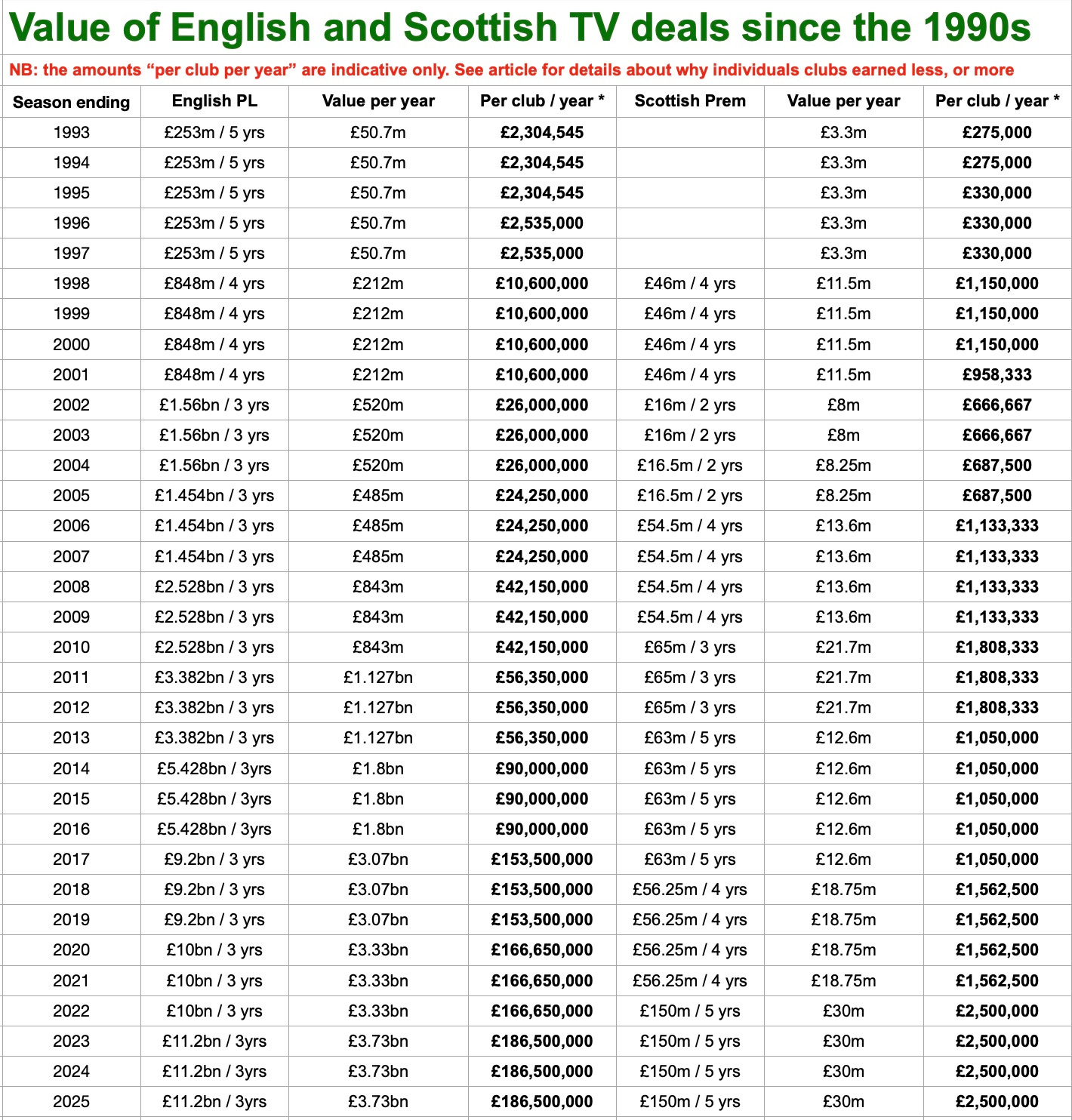 By this season, 2024-25, that has become £3.73 BILLION a year, to be shared between the 20 clubs, or the thick end of £3bn anyway, after giveaways to lower divisions and league running costs have been deducted.
