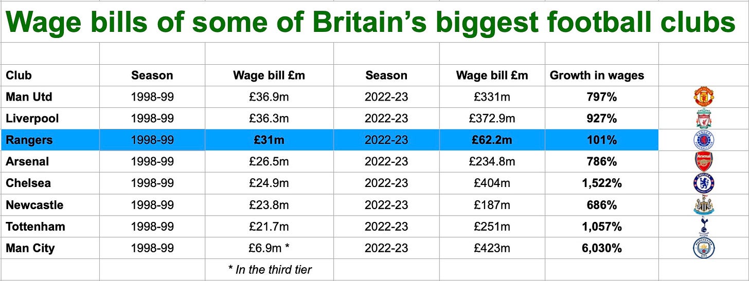 Rangers had a bigger wage bill than the teams who finished second and third behind United in the Premier League that year (Arsenal and Chelsea), and bigger than the runners-up in that season’s FA Cup final (Newcastle).