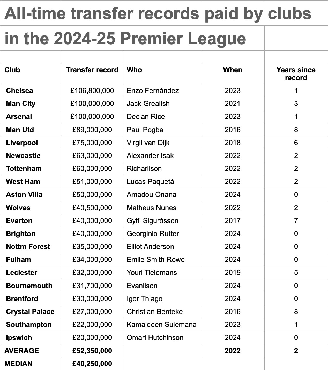 On average, the current Premier League clubs in England set their transfer fee records less than two years ago. Aside from the seven clubs setting records this summer, three others set theirs in 2023 and four more set theirs in 2022. It’s only the relatively old records of Crystal Palace and Manchester United (both set eight years ago), Everton (seven years ago) and Liverpool (six years ago) that make the divisional average as big as two years.