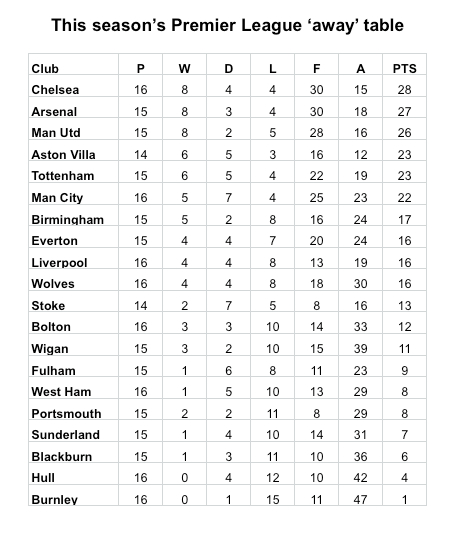 It’s never been harder to win points away from home than this season. Teams are winning fewer away points as a percentage of the total points that in any of the 17 completed seasons of the Premier League. How few? Those of a sickly disposition may want to look away now. (Just 293 points from 843 points won altogether, or 34.8 per cent). I know. It’s a shock. And the lion’s share of the points won away has gone to the big boys from Chelsea, Arsenal, Manchester United, Aston Villa, Tottenham and Manchester City, who have the best away records, in that order.