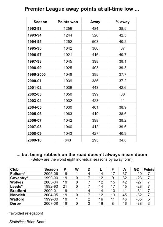 Meanwhile at the bottom of the table, Burnley (now in the care of Brian Laws) have a measly single away point, and the three other clubs having a particularly hard life this season on the road are Hull (now under Iain Dowie), Blackburn (Sam Allardyce) and Sunderland (Steve Bruce). What a sorry band. In as many as six of the 17 previous seasons, 40 per cent of total points (or more!) were won away from home, with the peak season being 2001-02, when 42.6 per cent - or 443 points from 1,039 points - were won away. This season it’s hovering just above one in three points away. Home wins are overshadowing away wins by 158 to 72. It’s enough to make a traveller weep. With three games remaining away from Turf Moor, Burnley still need two more points to even match the poorest ever total of away points in the Premier League: the three registered by Derby two seasons ago. Those away games don't come for a while, at Hull and Sunderland next month, then at Birmingham. But all is not yet lost for Burnley. Three of the teams among the eight teams with the poorest single-season away records in Premier League history still managed to avoid relegation. Fulham finished as high as 12th in 2005-06, Coventry 14th in 1999-2000 and Leeds 17th in 1992-93, even though they had all managed just seven away points. Joining Burnley with no away wins at all this season are Hull. If things don’t look up they could both be joining the five clubs in Premier League history to have already achieved that unwanted duck for a whole season: Coventry, Wolves, Leeds, Norwich and Derby. .