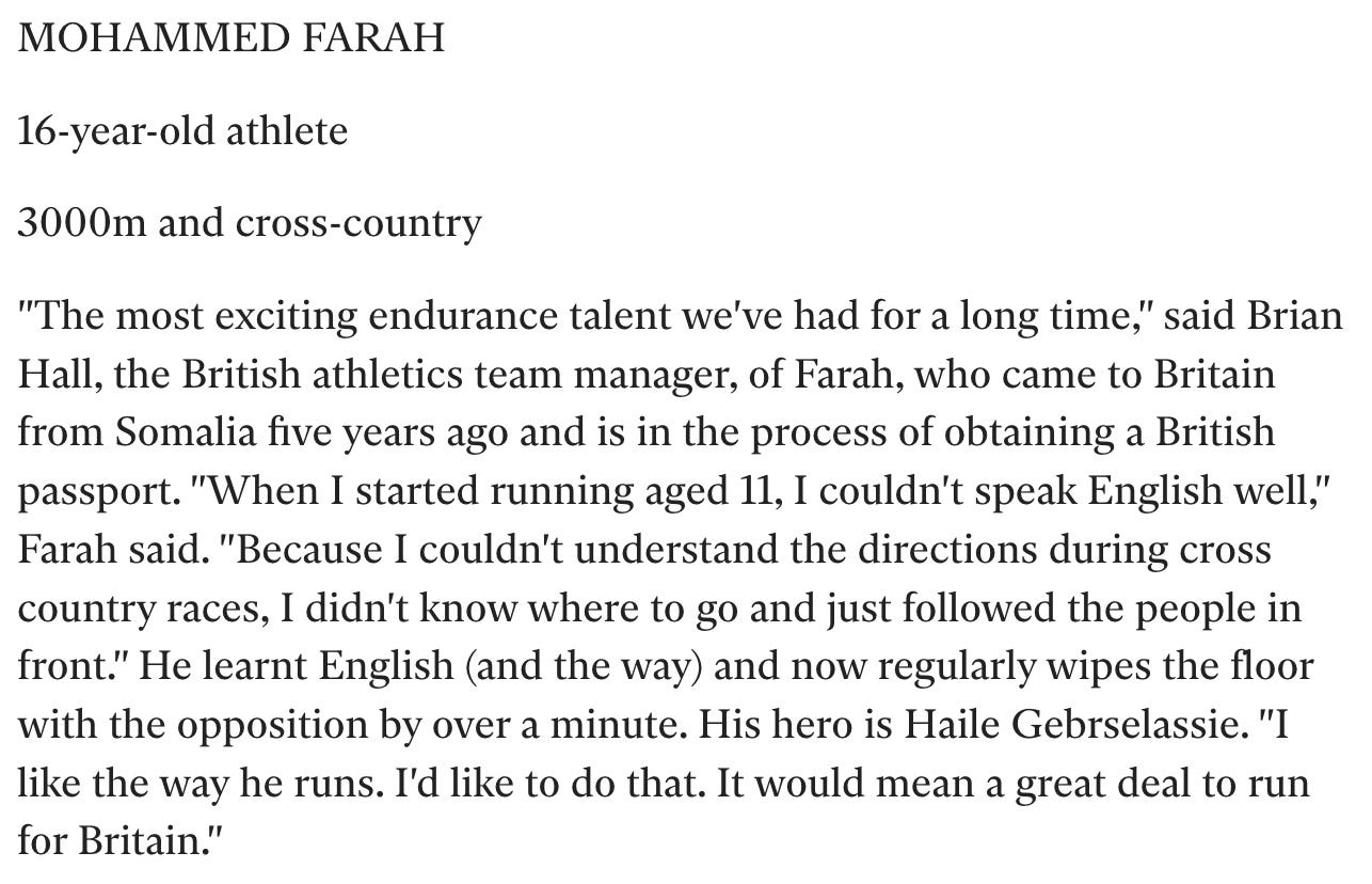 In The Independent we flagged him up (below) as Mohammed Farah, a promising 16-year-old 3,000m and cross country runner , and reported what Mo told me about not being able to speak English very well when he started running at 11. He told me that it wasn’t long before that that he’d moved to the UK from Somalia with his father, leaving his mum and siblings back in Africa.