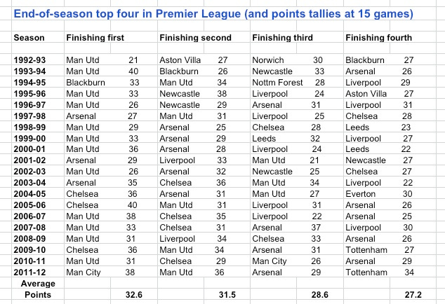 On that statistical reckoning, only the two Manchester clubs, plus Chelsea, Tottenham and West Bromwich Albion are in line for the top four this time round. They are the only ones with 26 points or more after 15 games.